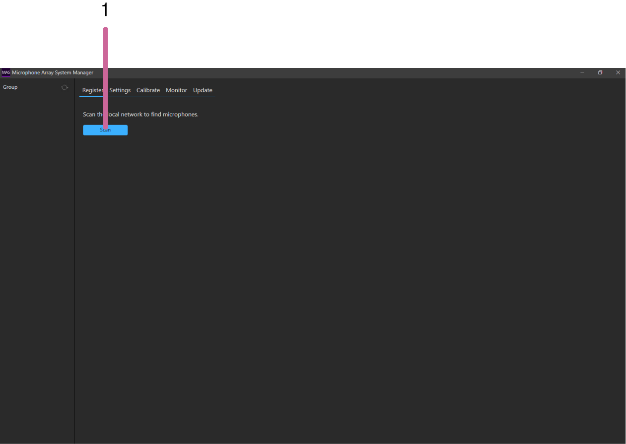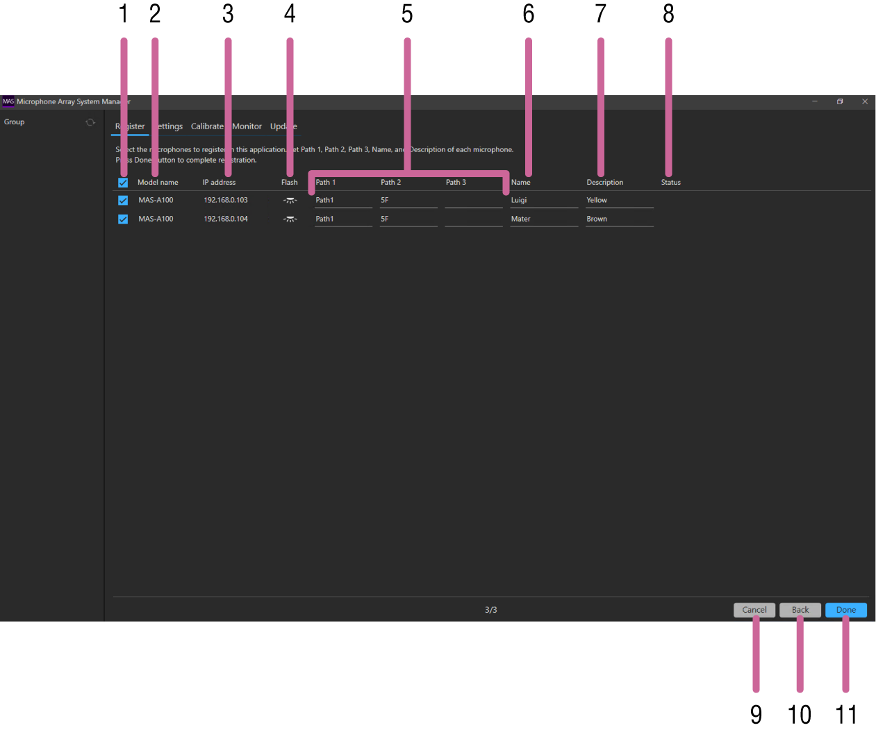 In [Path 1], [Path 2] und [Path 3] eingegebene Zeichenfolgen werden von dieser Anwendung als Namen der Gruppen verwendet, die im Bildschirmbereich [Group] zum Gruppieren von Mikrofonen angezeigt werden. Normalerweise müssen die Einträge in den Feldern [Path 1], [Path 2] und [Path 3] für im selben Raum befindliche MAS-A100-Einheiten identisch sein.