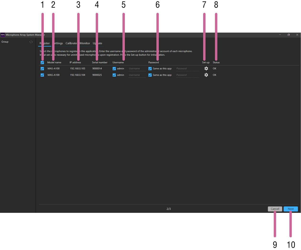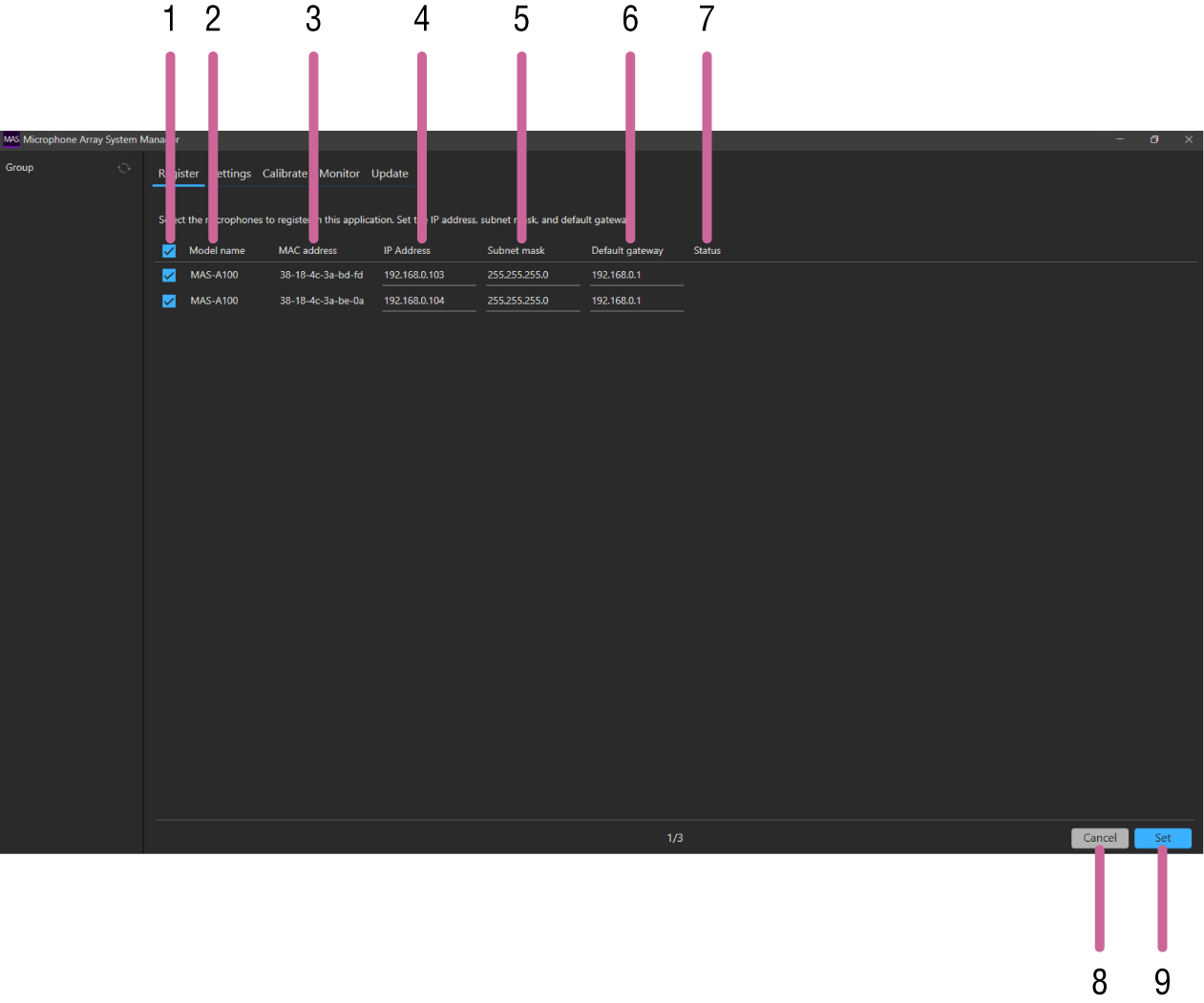Zeigt eine Liste der auf dem Suchergebnisbildschirm ausgewählten MAS-A100-Einheiten an. Konfigurieren Sie die erforderlichen Einstellungen für die Steuerung der einzelnen MAS-A100 in dieser Anwendung.