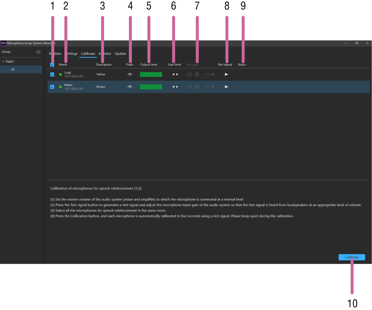 Klicken Sie auf diese Schaltfläche, um die Kalibrierung zu starten. Von jedem MAS-A100 wird ungefähr 5 Sekunden lang ein Rauschsignal ausgegeben.