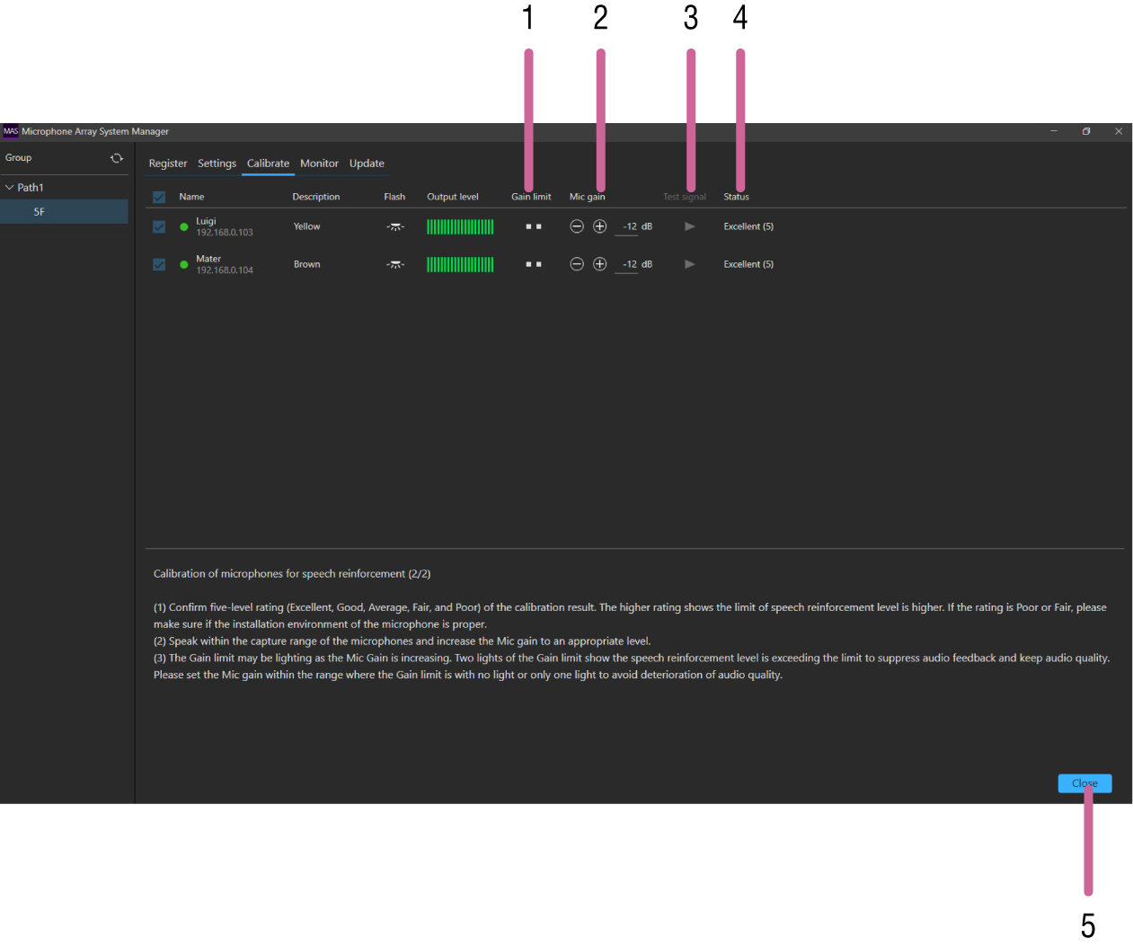 Wendet die Mikrofonverstärkungseinstellungen an und beendet die Kalibrierung.