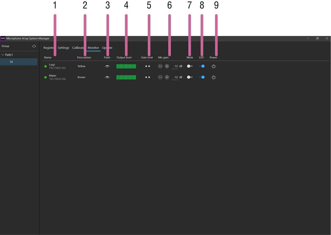 Zeigt die Status-LED, den Namen und die IP-Adresse des jeweiligen MAS-A100 an.