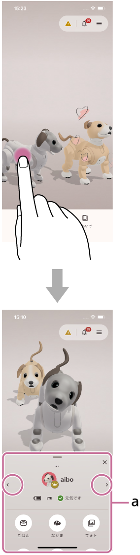 複数のaiboを登録している場合、左右の矢印マークをタップすると、表示するaiboを切り替えることができます。