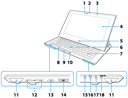 Describe las funciones en el frente de la computadora VAIO, tales como los botones y los indicadores luminosos.