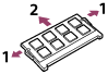 5. Si aucune fente n'est libre, retirez le module de mémoire installé. Tirez les languettes dans le sens des flèches pour dégager le module au niveau d’un angle (1), retirez ensuite le module en respectant l’orientation de la flèche (2).