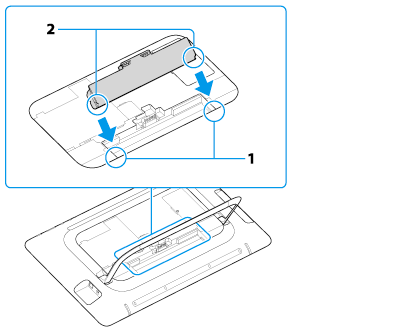 Slide the battery pack diagonally into the battery compartment until the projection (1) on each side of the battery compartment fits into the groove (2) on each side of the battery pack.
