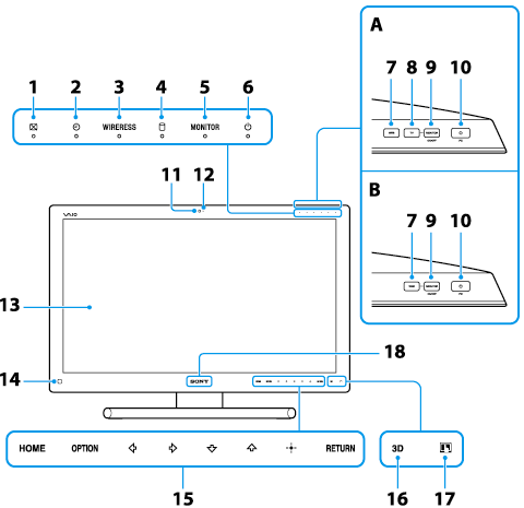 Describes the features on the front of the VAIO computer, such as buttons and indicator lights.