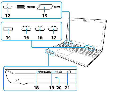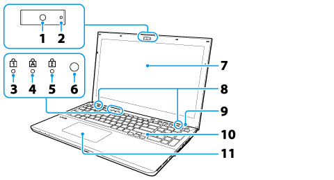 Describes the features on the front of the VAIO computer, such as buttons and indicator lights.