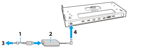 And then, plug the cable from the AC adapter into the DC IN port (4) on the port replicator.