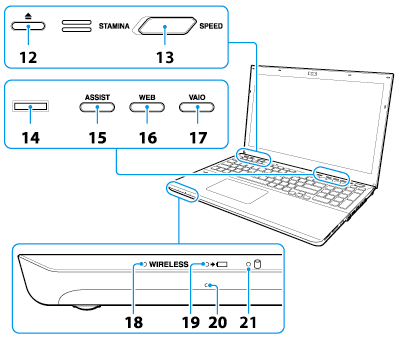Describes the features on the front of the VAIO computer, such as buttons and indicator lights.