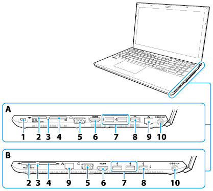 Décrit les fonctionnalités sur les côtés de l'ordinateur VAIO, telles que les ports de connexion.