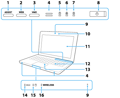 Describes the features on the front of the VAIO computer, such as buttons and indicator lights.