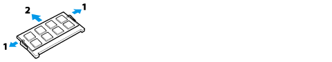1. Si aucune fente n'est libre, retirez le module de mémoire installé. Tirez les languettes dans le sens des flèches pour dégager le module (1), retirez ensuite le module en respectant l'orientation de la flèche (2).