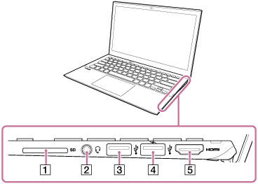 VAIO 컴퓨터 옆면의 기능(예: 연결 포트)을 설명합니다.