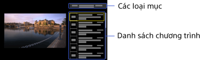 để chọn loại mục mong muốn.Chọn chương trình mong muốn từ danh sách chương trình bằng cách sử dụng các nút PROG +/- hoặc