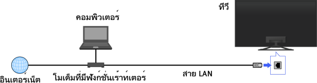การเชื่อมต่อ LAN แบบใช้สายจะช่วยให้ท่านสามารถเข้าใช้งานอินเตอร์เน็ตและเครือข่ายที่บ้านได้ เชื่อมต่อสาย LAN เข้ากับทีวี