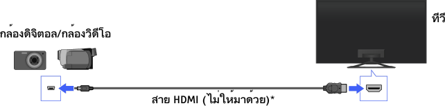 เชื่อมต่อกล้องดิจิตอล Sony หรือกล้องวิดีโอโดยใช้สาย HDMI ใช้สายสัญญาณที่มีปลั๊กต่อ HDMI ขนาดเล็กสำหรับปลายด้านที่ต่อกับกล้องดิจิตอล/กล้องวิดีโอ และปลั๊กต่อ HDMI มาตรฐานสำหรับปลายด้านที่ต่อกับทีวี