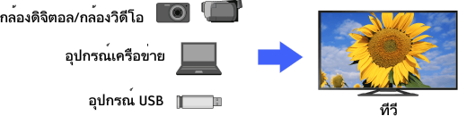 ภาพที่มีขนาด 4K หรือมีความละเอียดภาพสูงกว่าสามารถแสดงได้ในความละเอียดภาพ 4K (3840 x 2160) กล้องดิจิตอล/กล้องวิดีโอที่ใช้แสดง HDMI ขนาด 4K ได้เชื่อมต่อเข้ากับ HDMI IN หรือภาพที่มีความละเอียดสูงซึ่งจัดเก็บอยู่ในอุปกรณ์ USB หรืออุปกรณ์เครือข่าย จะแสดงบนทีวีด้วยความละเอียดภาพที่ 4K
