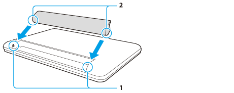 1. 將電池傾斜推入電池室,直到電池室兩邊的凸出部分 (1) 吻合電池兩邊的凹槽 (2) 為止。