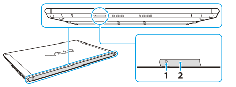 請將細直的物體(例如迴紋針)插入 VAIO 電腦背面的 SIM 卡匣 (2) 孔 (1) 中,使卡匣彈出。