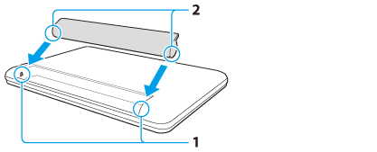 將電池傾斜推入電池室,直到電池室兩邊的凸出部分 (1) 吻合電池兩邊的凹槽 (2) 為止。