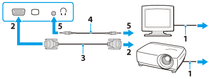 如果需要,請使用喇叭電纜 (4)(未隨附)將外部顯示器或投影機連接至 VAIO 電腦上的耳機插孔 (5)。