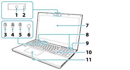 Describes the features on the front of the VAIO computer, such as buttons and indicator lights.