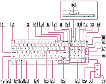 Describes the features of the keyboard, such as keys, buttons and indicator lights.