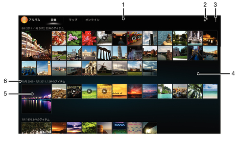 | 2 | 機器に保存した写真とビデオを収納している全フォルダの一覧表示に切り替えます。 |