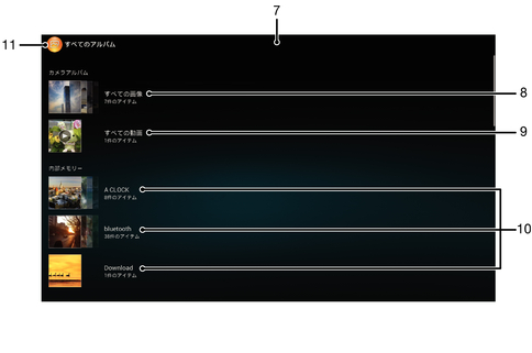 | 7 | 機器に保存した写真とビデオを収納している全フォルダの一覧表示です。 |