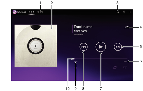 | 10 | 진행률 표시기 – 표시기를 끌거나 선의 특정 지점을 눌러 빨리 감거나 되감습니다. |