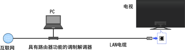 有线LAN连接可让您访问互联网和家庭网络。将LAN电缆连接到电视机。