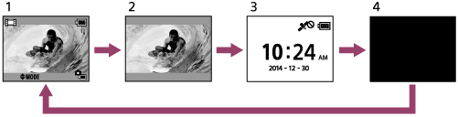 Saat pengendali jarak jauh terhubung ke kamera melalui Wi-Fi, menekan tombol DISP pengendali jarak jauh akan mengalihkan tampilan layar LCD sebagai berikut.