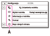 Menu [Aparat/Mikrofon], [Sieć bezprzewodowa] i [Konfiguracja] zawierają podkategorie. Wybierz ikonę podkategorii, tak aby można było wybrać żądaną opcję menu.