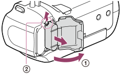 ) a potom vyberte z produktu batériu posunutím uvoľňovacej páčky batérie (
