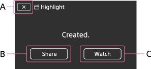 B: Zobrazí sa obrazovka, na ktorej si môžete vybrať zdieľanie vytvoreného videozáznamu s najlepšími scénami v smartfóne alebo počítači. Na zdieľanie videozáznamu s najlepšími scénami budete potrebovať pripojenie Wi-Fi* alebo pripojenie USB.