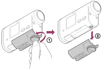 Draai de schroef van de statiefadapter los in de richting van de pijl en verwijder de statiefadapter van de camera.