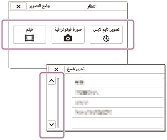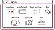 تحتوي قوائم [كاميرا/ميكروفون] و [لاسلكي] و [إعداد] على فئات فرعية. اختر رمز الفئة الفرعية حتى تتمكن من اختيار عنصر القائمة المرغوب.