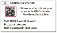 - Si le caméscope ne peut pas être connecté au smartphone via NFC ou en lisant le QR Code, connectez-le à l’aide du SSID et du mot de passe.