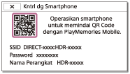 - Mulai PlayMemories Mobile, pilih [Pindai QR Code Kamera] - [OK] - [OK], lalu pindai QR Code yang ditampilkan pada layar LCD produk ini dengan smartphone atau tablet Anda.