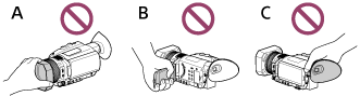 - لا تمسك كاميرا الفيديو من الأجزاء التالية، وكذلك لا تمسكها من أغطية المقبس.