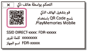 - بعد أن تتم قراءة QR Code ويتم التوصيل بنجاح، يتم تسجيل SSID (DIRECT-xxxx) وكلمة المرور الخاصة بكاميرا الفيديو على الهاتف الذكي. توصيلات Wi-Fi اللاحقة بين كاميرا الفيديو وهاتفك الذكي لن تتطلب سوى اختيار SSID الخاص بكاميرا الفيديو والمسجل على الهاتف الذكي.