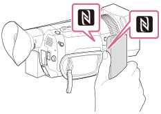 (علامت N) روی نمایشگر LCD دوربین فیلمبرداری نمایان شود. - دوربین فیلمبرداری و تلفن هوشمند خود را باهم گرفته و برای حدود 1-2 ثانیه ثابت نگه دارید تا PlayMemories Mobile روی تلفن هوشمند شما شروع شود.