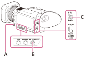 - هنگامی که کلید AUTO/MANUAL را روی AUTO تنظیم میکنید، دیافراگم، بهره، حساسیت ISO، سرعت شاتر و توزان سفیدی بطور خودکار تنظیم میشوند. شما نمیتوانید آنها را بطور دستی تنظیم کنید.