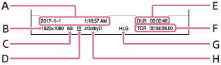 F: код времени начала записи (он не будет отображаться надлежащим образом при воспроизведении карты памяти без кода времени или карты памяти с кодом времени, который не поддерживается видеокамерой.)