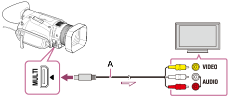- Під’єднайте роз’єм Multi/Micro USB на відеокамері та роз’єм VIDEO/AUDIO на телевізорі за допомогою кабелю AV (продається окремо).