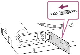 - Verschuif de schakelaar op het deksel van de accu/geheugenkaart om het deksel te openen.