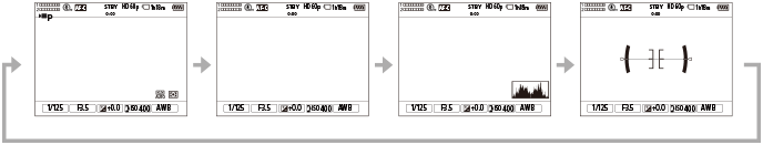 Genom att trycka på DISP (visningssätt)-knappen kan du ändra vilket innehåll som visas på skärmen under tagning och visning. Skärmen växlar varje gång DISP-knappen trycks in.