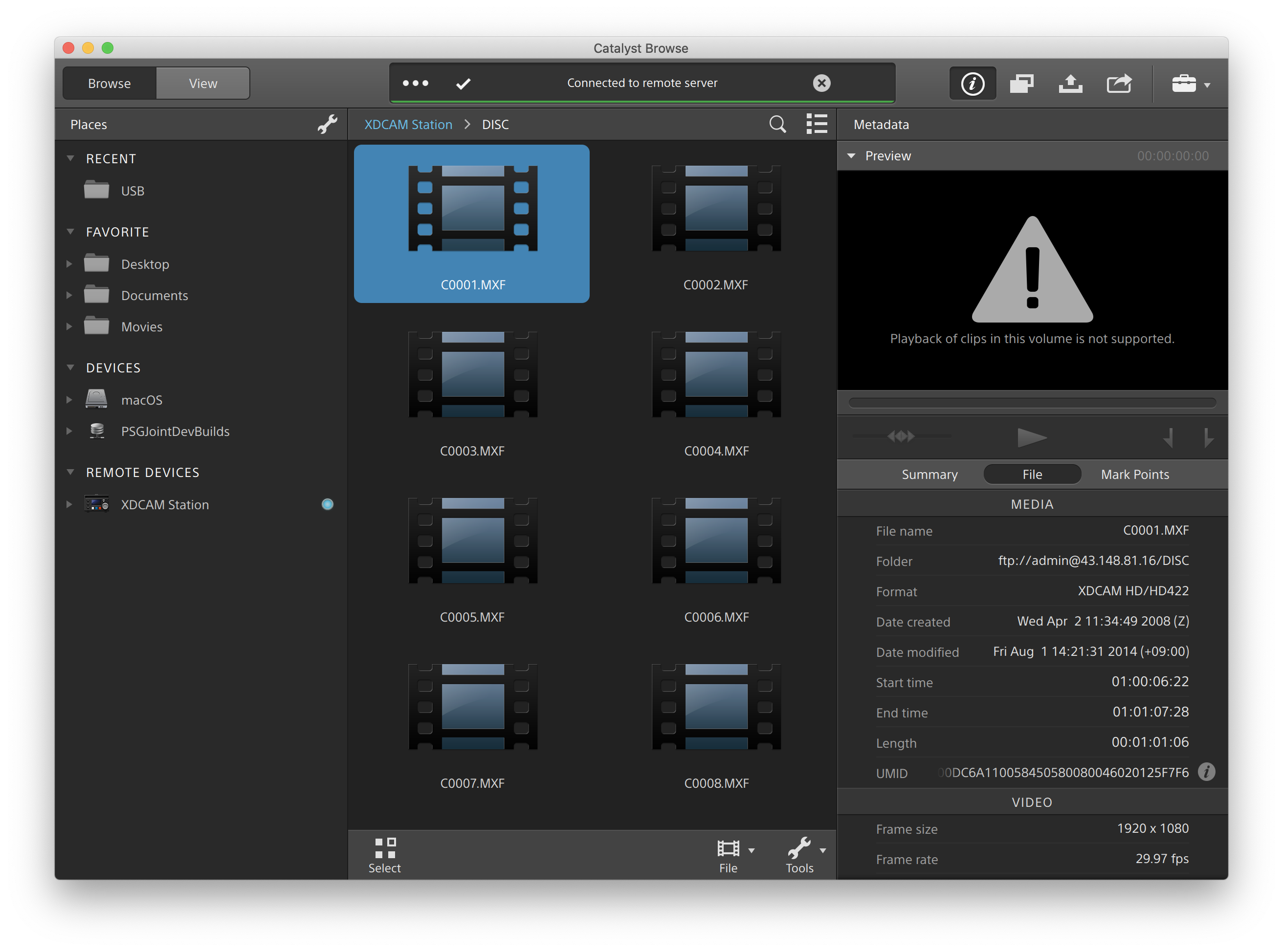 Working with clips from an FTP server is as simple as working with clips from your local computer or an external drive. After you connect to an FTP device, it will be displayed in a Remote Devices list in the Places pane, and you can browse it in the same way you browse other volumes.