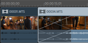 Wenn Sie zwei Clips überlappen, wird eine Überblendung als Übergang zwischen den zwei Clips Verwendet.