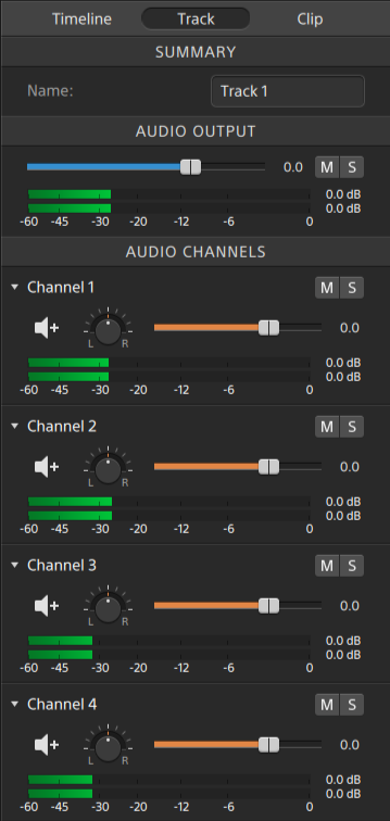Catalyst Edit 窗口顶部的活动窗口中的计量表和时间线调析器中的音频计量表将显示播放期间的瞬时音量,从而帮助您确定音频信号中的最大音量以及信号是否限幅。此峰值音量表示光标位置处的所有音频的总音量。